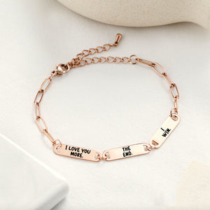 Laissez-vous séduire par le magnifique sentiment d'amour avec le bracelet 3 plaques en or rose I Love You More. Fabriqué en or rose délicat, ce bracelet comporte trois pendentifs en plaque sur lesquels sont inscrits les mots puissants « I love you more ». Un rappel quotidien de l'amour illimité et inconditionnel que vous partagez avec votre être cher.